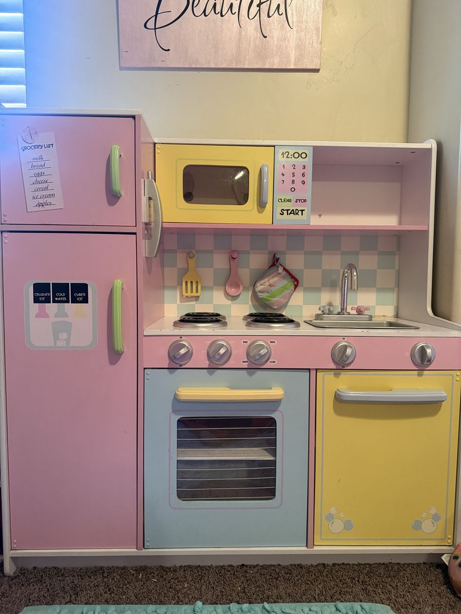 VenmoKids play kitchen set. Dimensions are L 42” H 42” W 16”. In great condition. Only selling because daughter has outgrown it. Also have various toy food/utensils included if wanted.