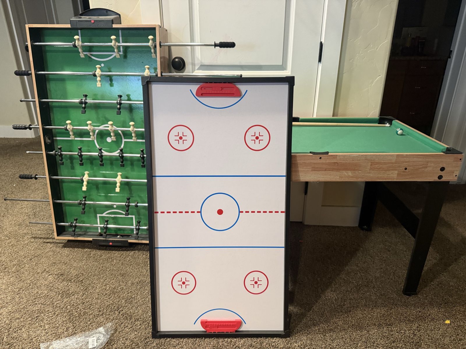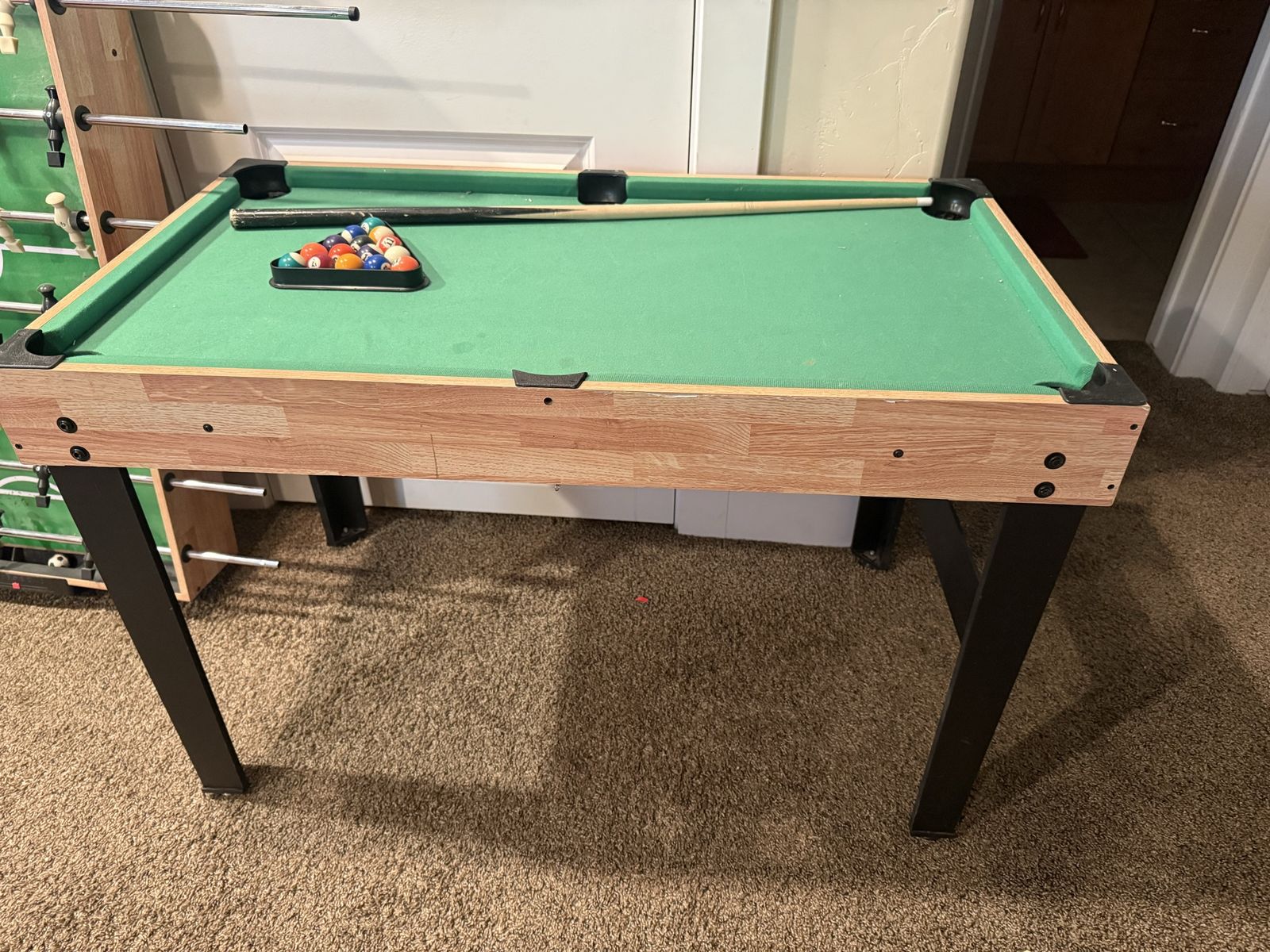 VenmoVarious gaming options including billiards, ping pong, hockey, foosball, shuffleboard, and others. All accessories included, however, only have 1 billiard stick.
