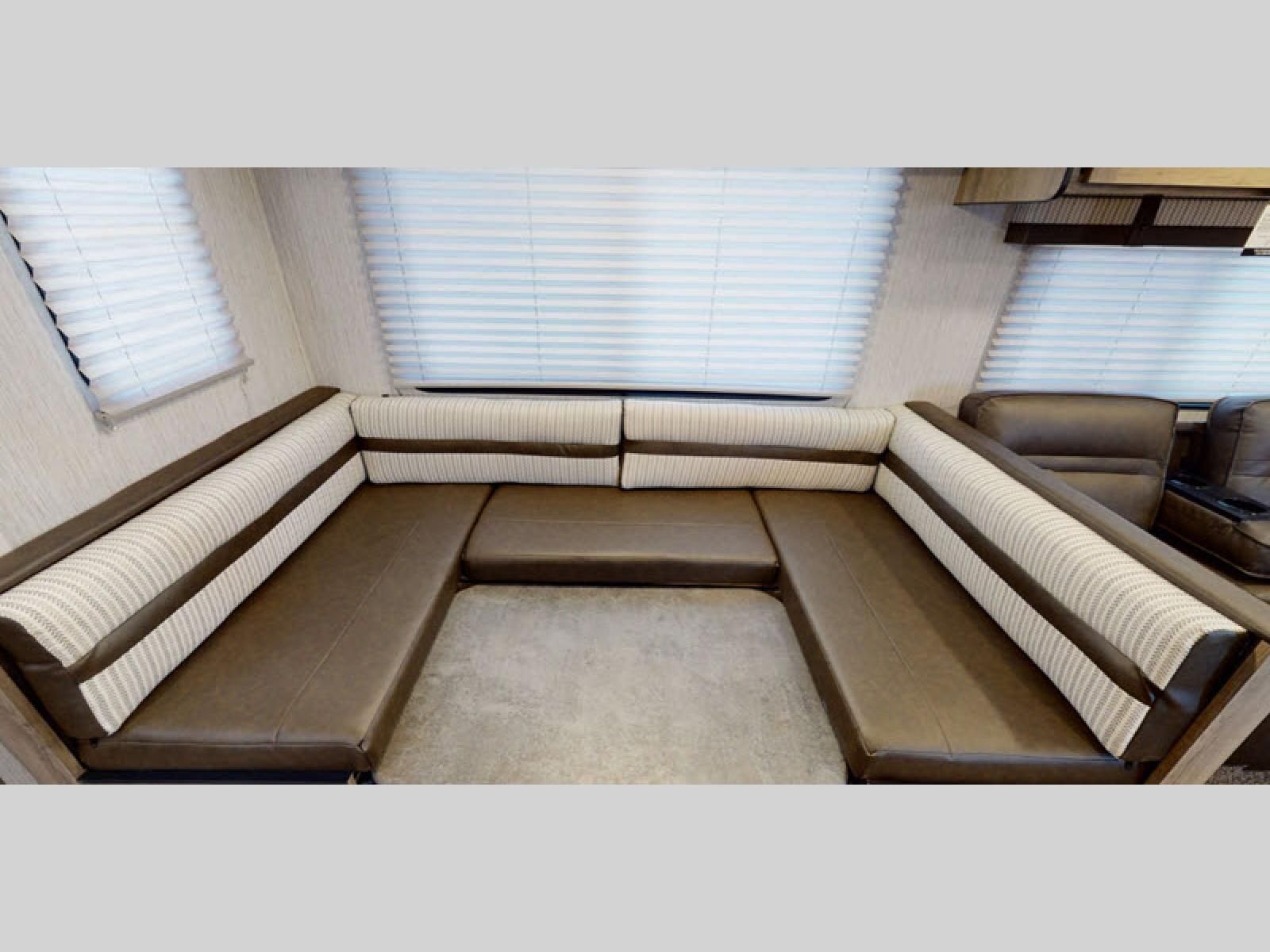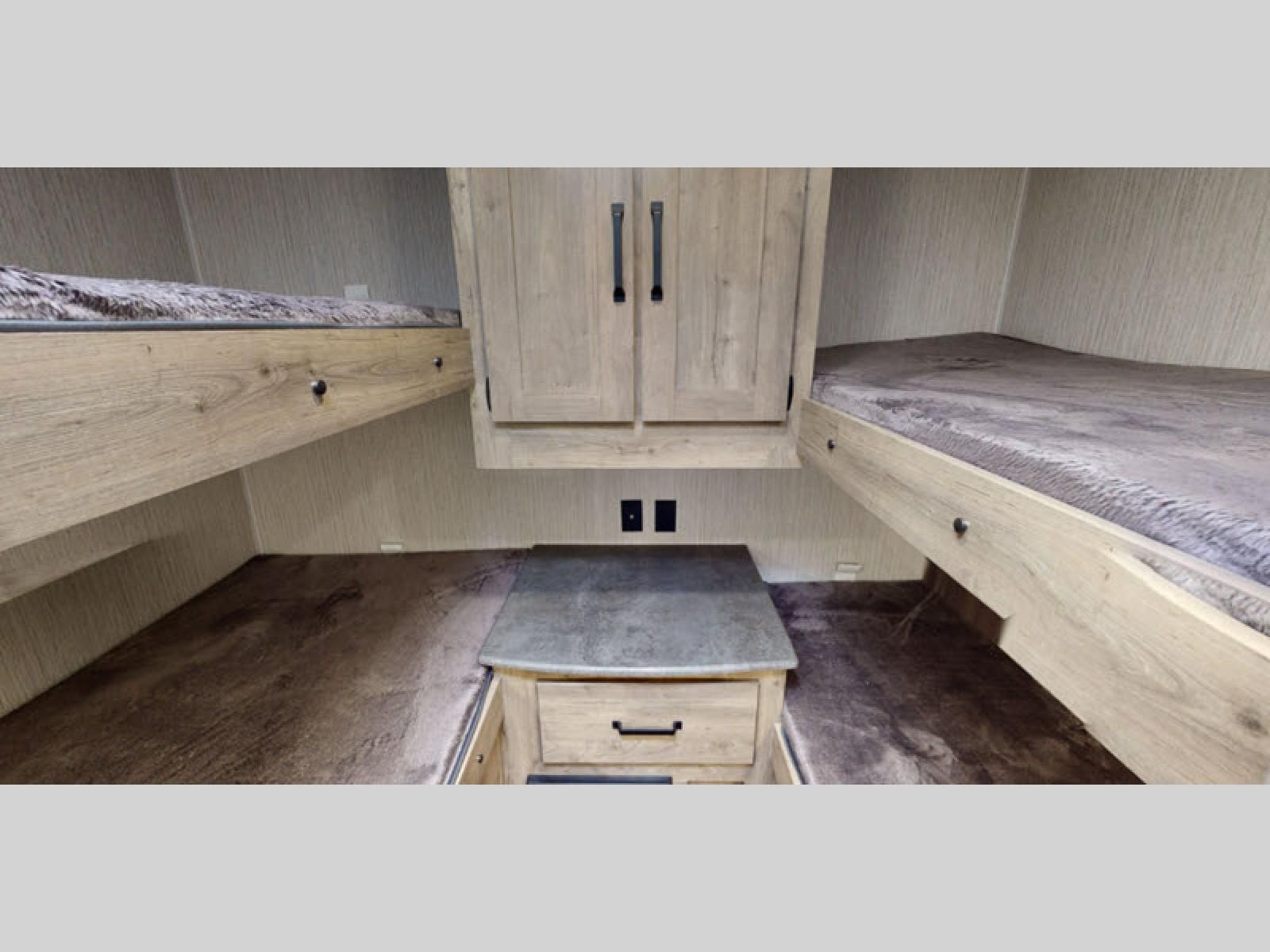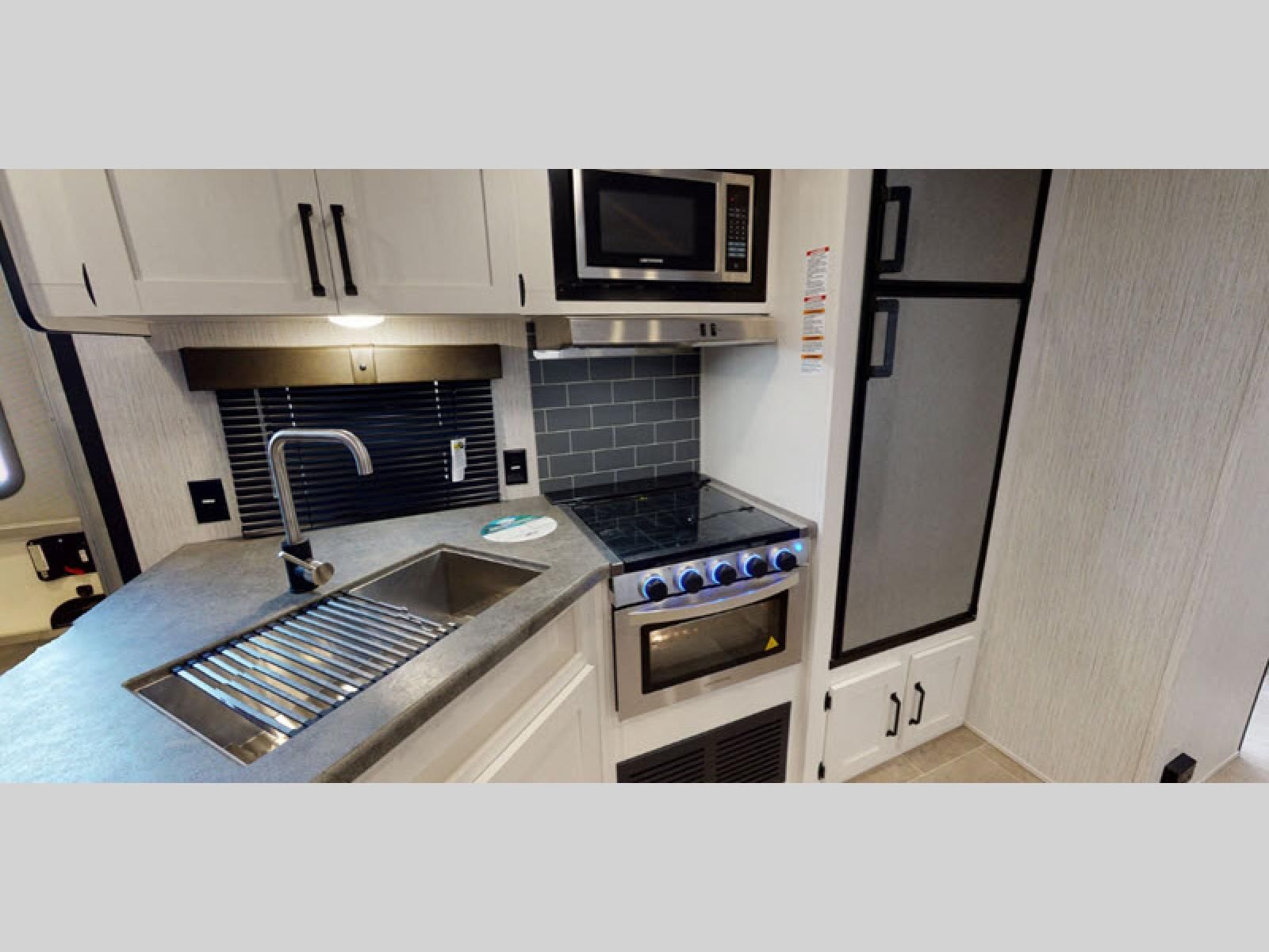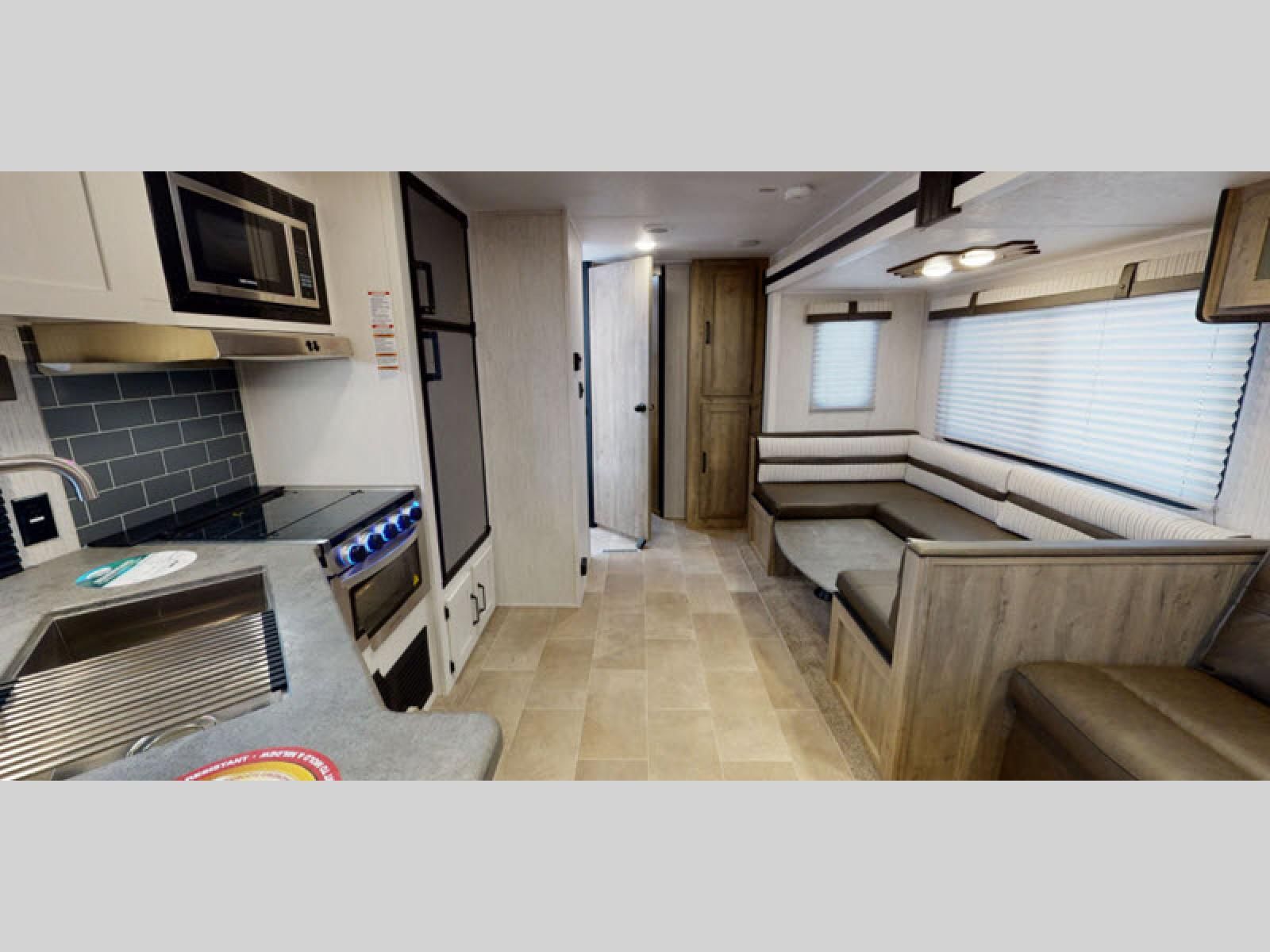 If you're looking to camp with the whole family or a group of friends, take a look at this spacious travel trailer. The kids or your friends will have their own private bunkhouse with four bunks and a wardrobe to store their clothes, and you can enjoy the private bedroom up front. Within the large slide out you'll find the U-shaped dinette and a sofa that will be perfect for relaxing, game night, and additional sleeping space. The chef can cook on the three burner cooktop, or use the stainless steel microwave, and the optional outside kitchen or camp kitchen both come with a griddle, so you might like to add one of those.
