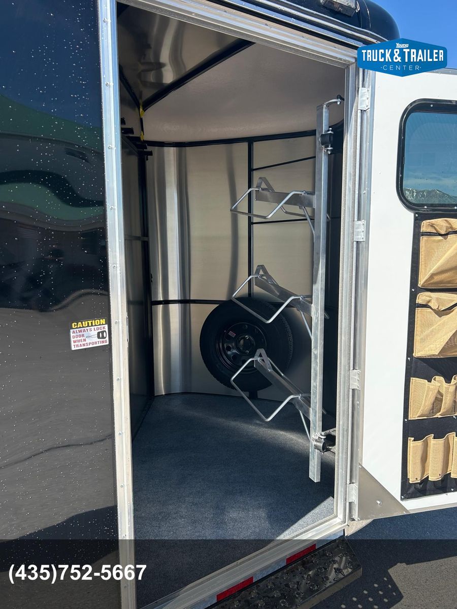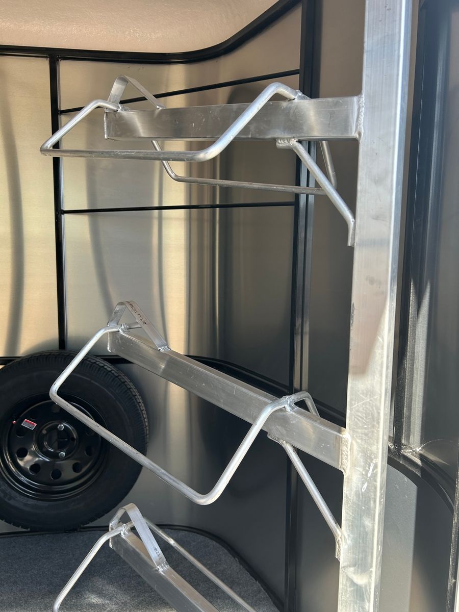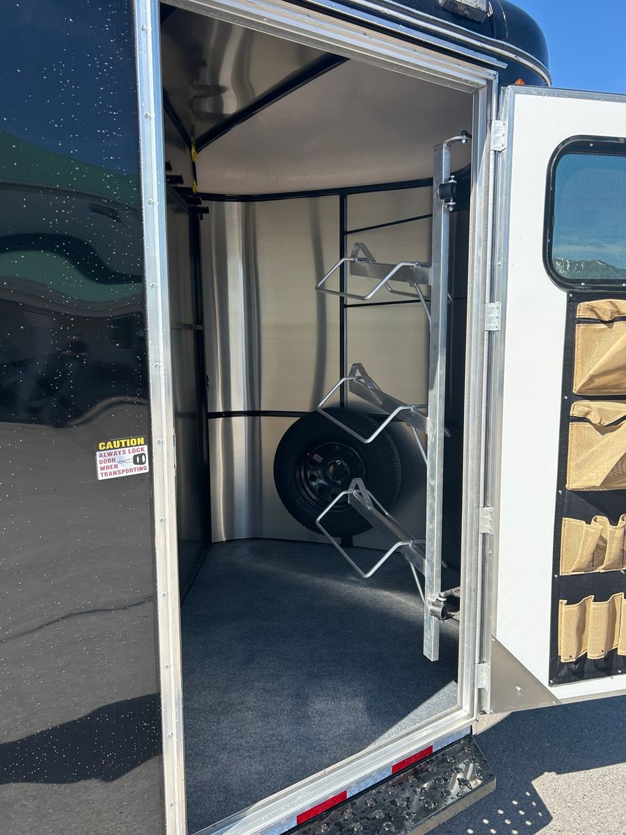 3 Horse Slant Load Front Sealed Tack Swing Out Saddle Racks Door Organizer Bridle Hooks Horse Area Has Floor Mats Aluminum Jail Bar Divider w/ Pad Spare Tire