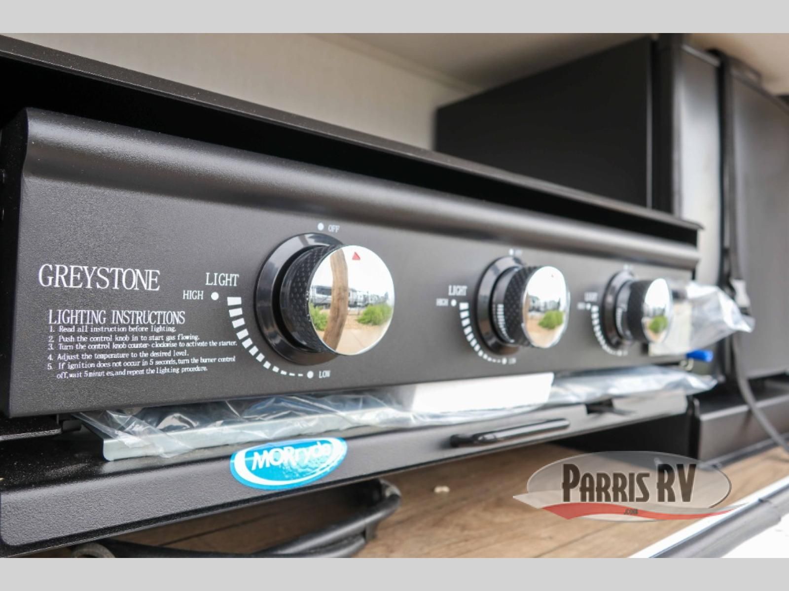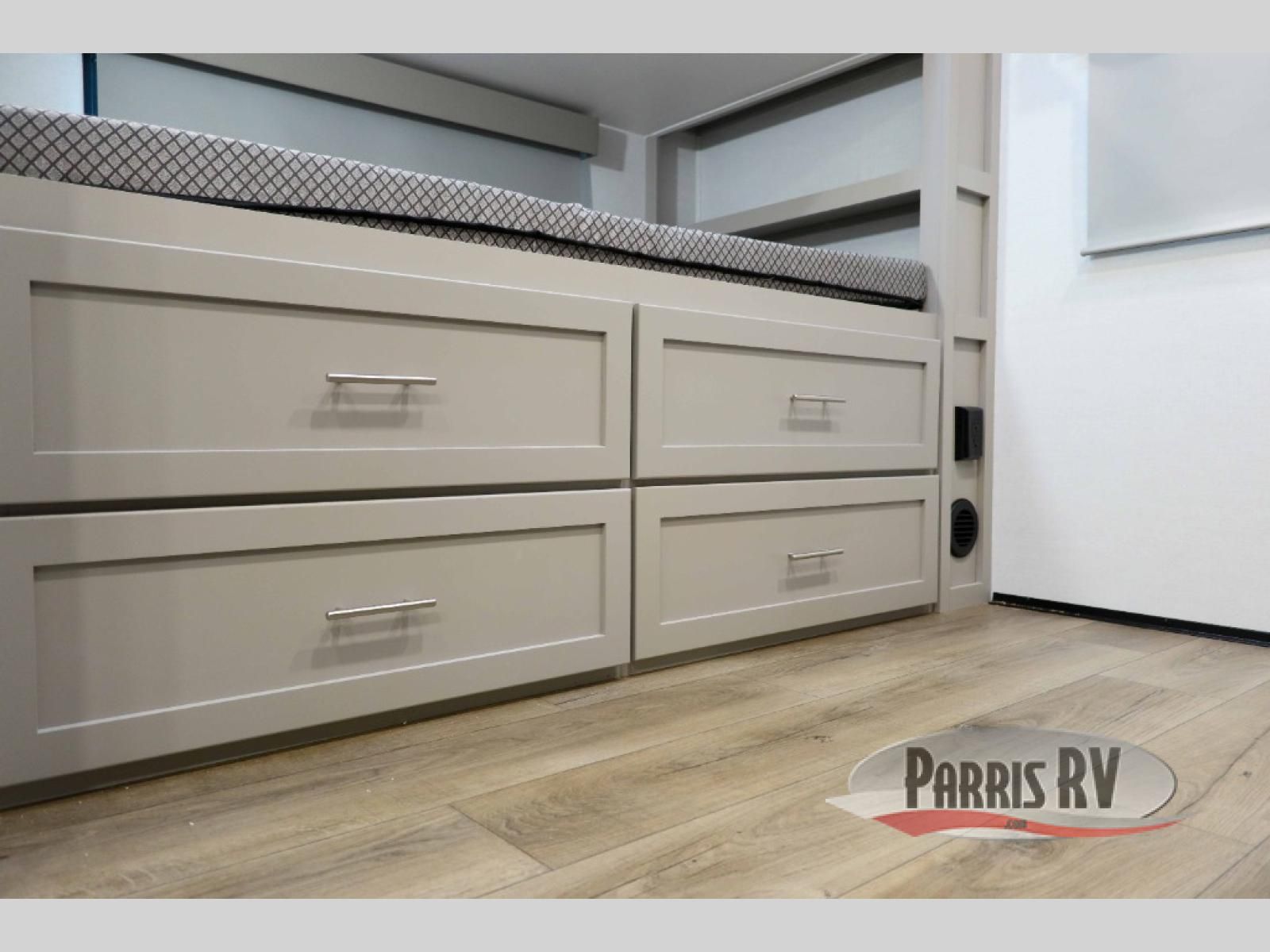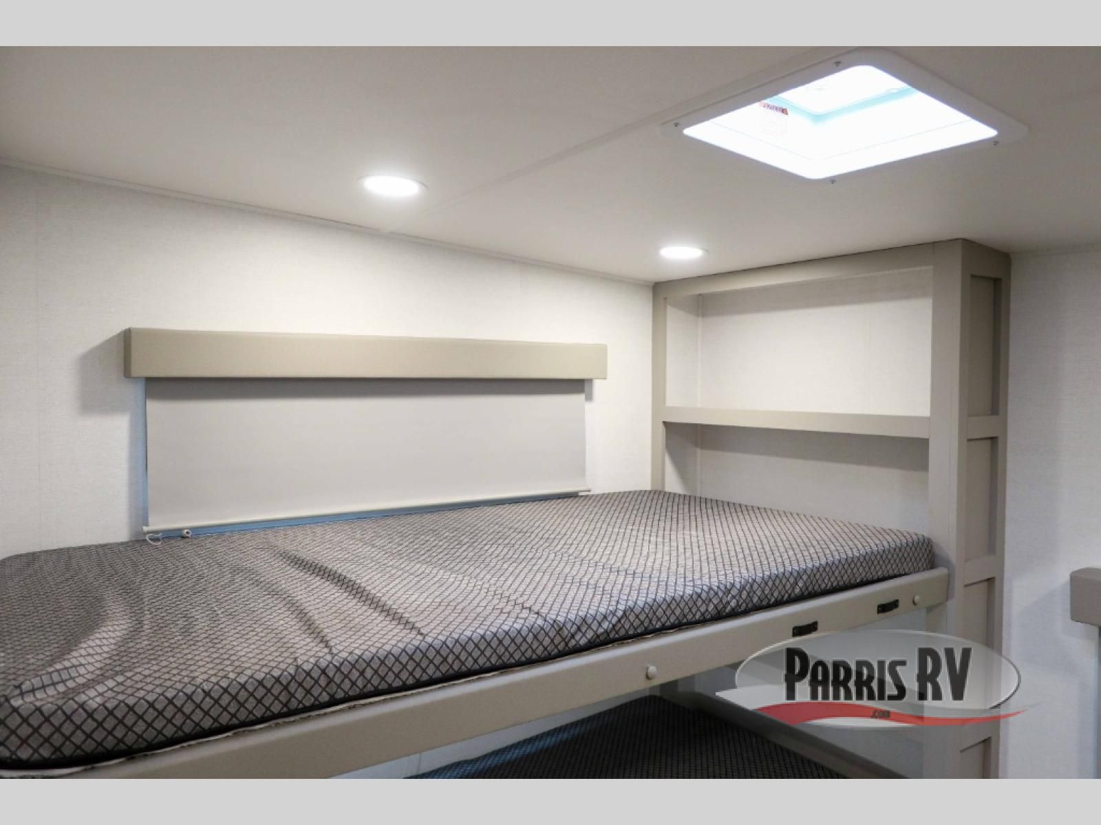 If you've been searching for a fifth wheel with more sleeping space, this is the one! You will find a queen bed in the front private bedroom, along with a wardrobe with washer and dryer prep and overhead storage for your things. Your guests can take the rear bunkhouse that includes 40" x 72" bunks across from a slide out with a flip-up bunk and cube sofa below. Everyone can meet in the middle living area and kitchen to relax on the sofa that is in direct view of the 50" Class HDTV. There is also a booth dinette table here to dine together. If the weather is nice, you may just find yourselves outdoors since there are two awnings and an exterior griddle!