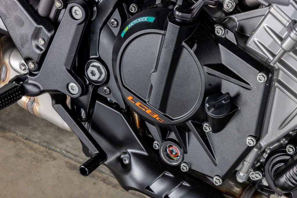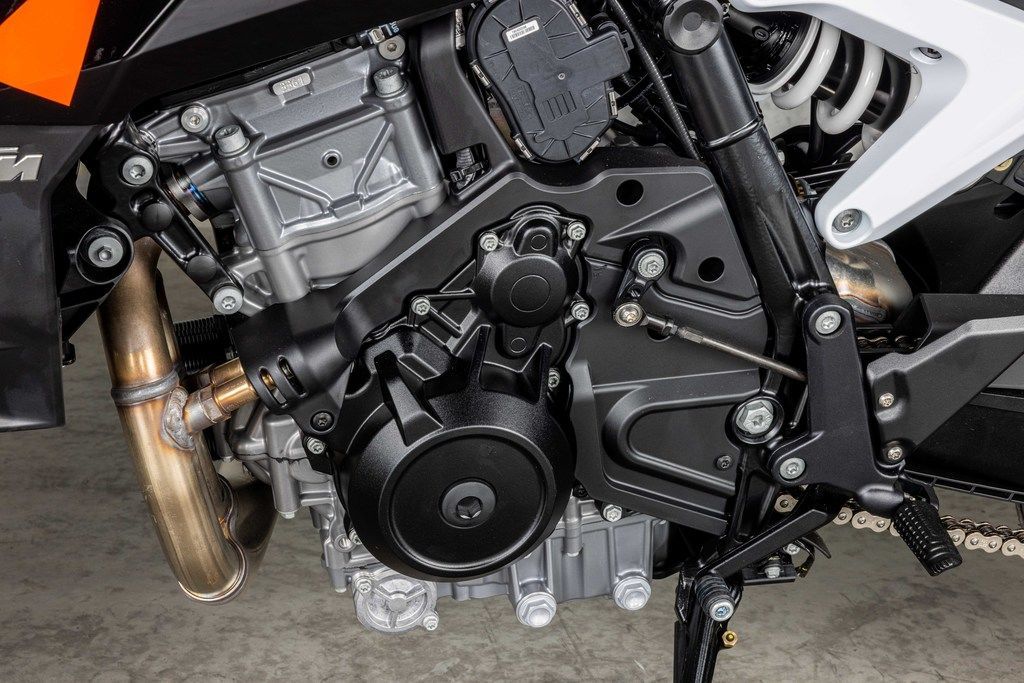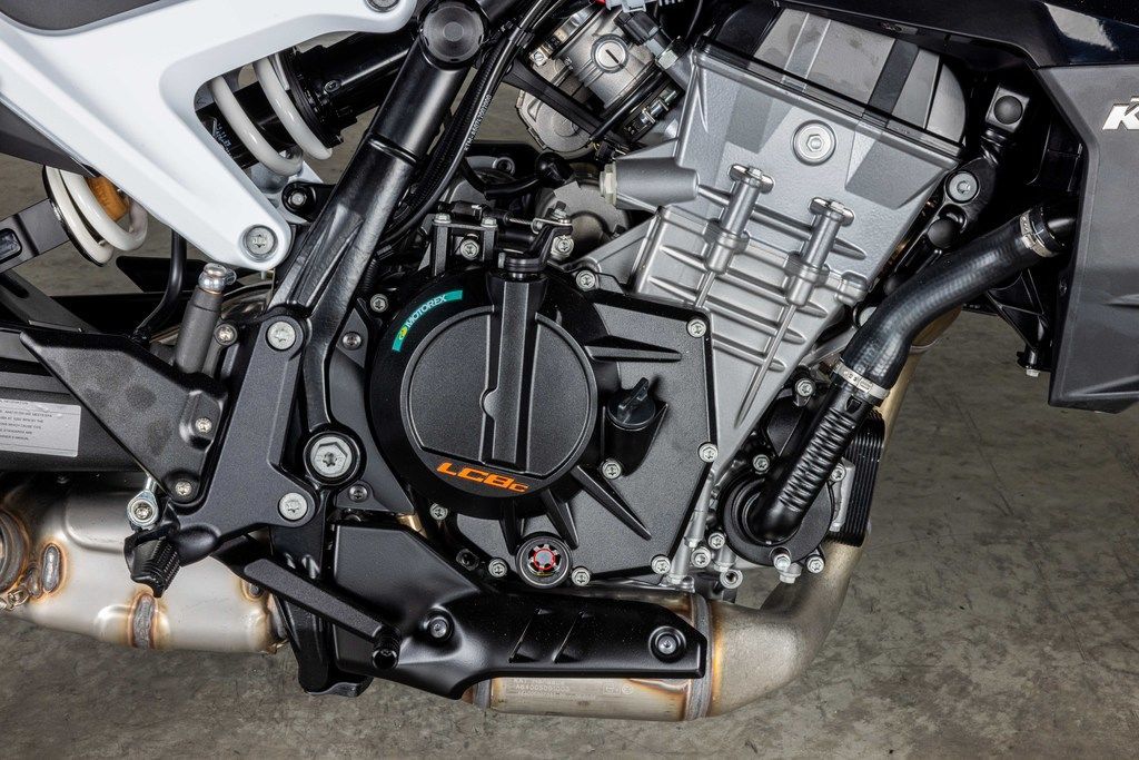 Of course, this isn't the first time the DUKE nameplate and 990 have been seen together. However, this machine is a completely different powerplant. Nestled into the all-new frame is a 990 cc LC8c parallel-twin engine pumping out asphalt-ripping power. Not only powerful, it is also the most compact twin in class, adding to the KTM 990 DUKE's nimble handling characteristics. More aggressive camshaft profiles and longer valve openings result in improved rideability, while a wider radiator with optimized airflow ensures things stay cool. A new exhaust system rounds off this powerhouse package.