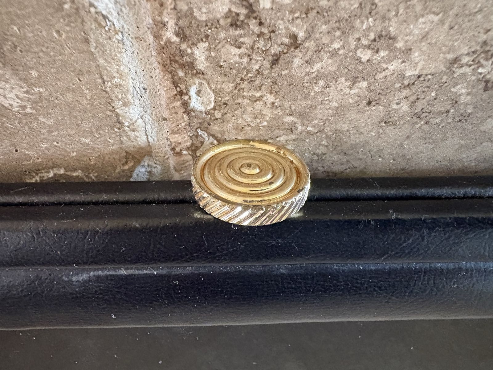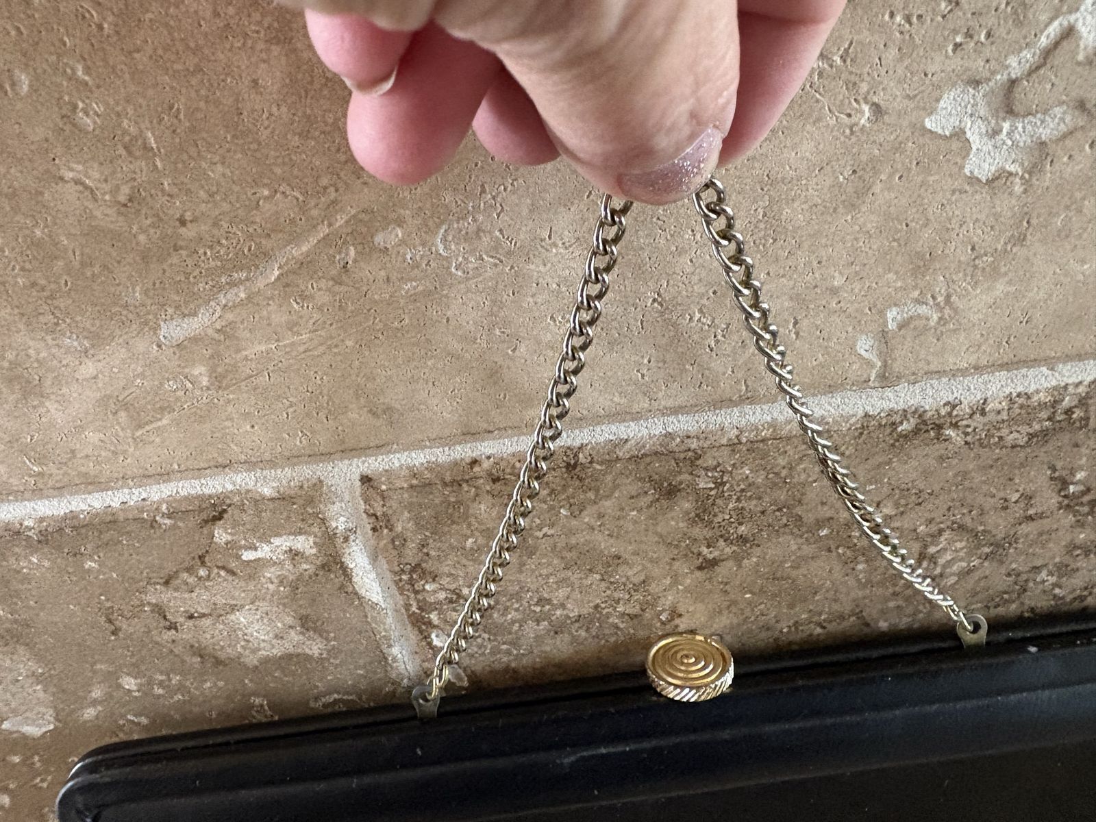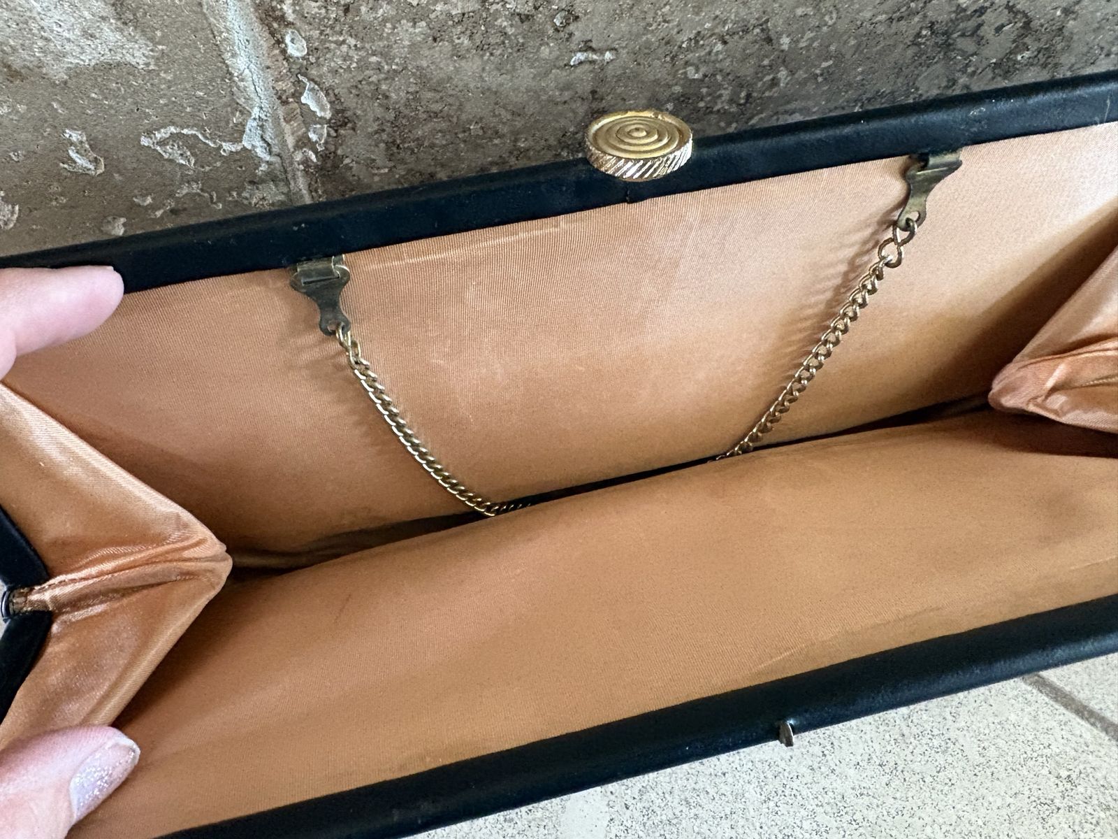 I have a long thin vintage black patent leather clutch purse. It has a round gold clasp and small chain that can be pulled out if you want a small handle. It is 12 3/4 inches long and 5 3/4 inches tall. There are a couple of light marks from being used. See my other ads for jewelry, artwork, home decor and more.