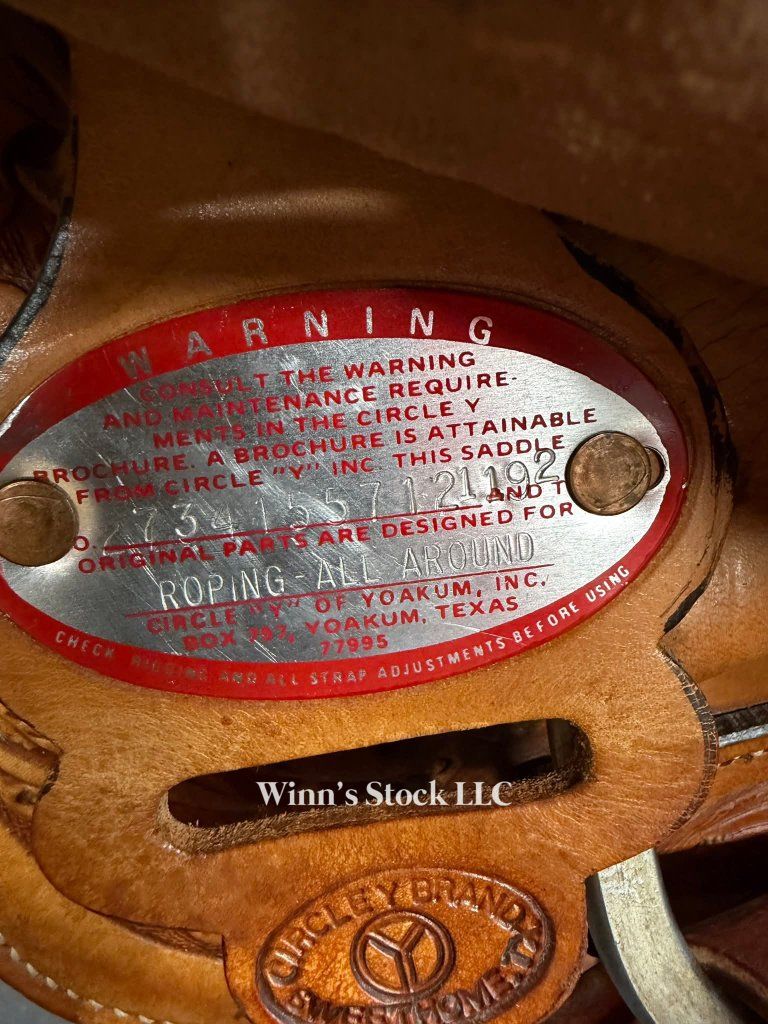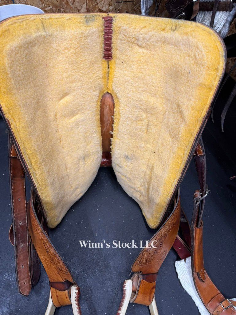 This saddle features a 15.5" padded suede seat, 6 3/4" gullet, SQH bars, dees on back conchos for leather ties if needed, stainless rigging, rawhide wrapped stirrups, fleece is good, and weight is around 35lbs.