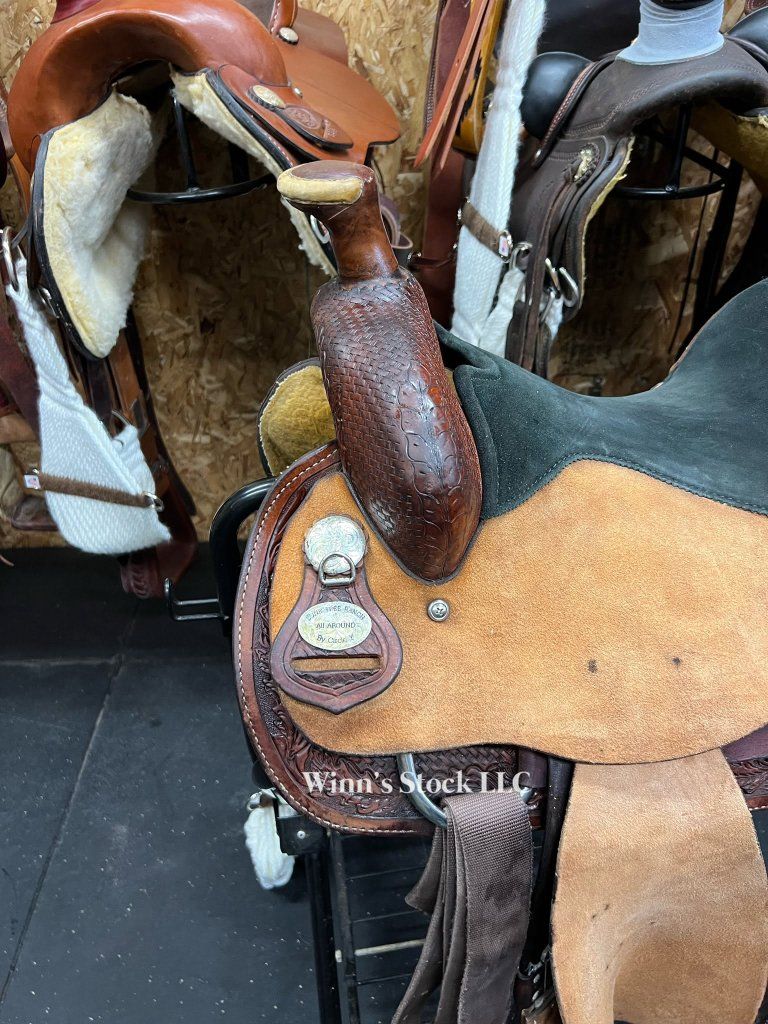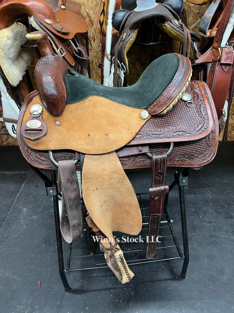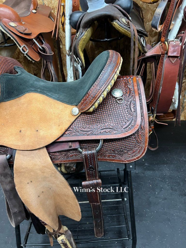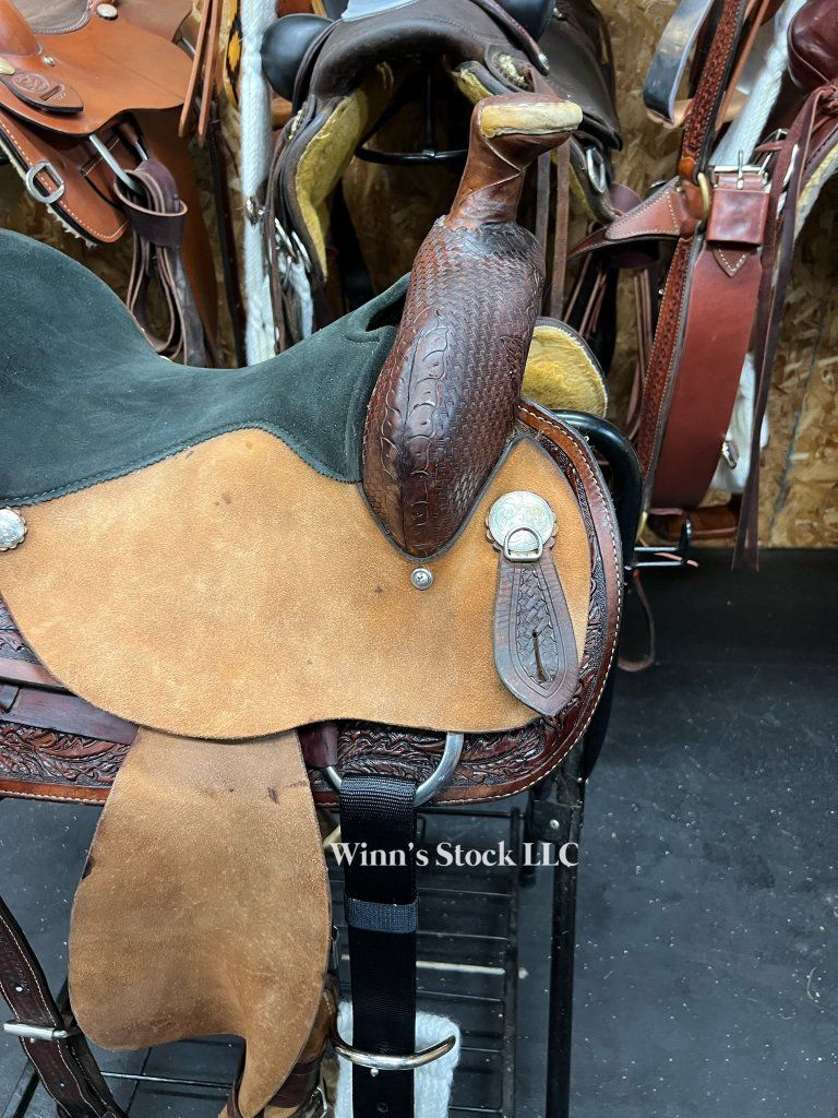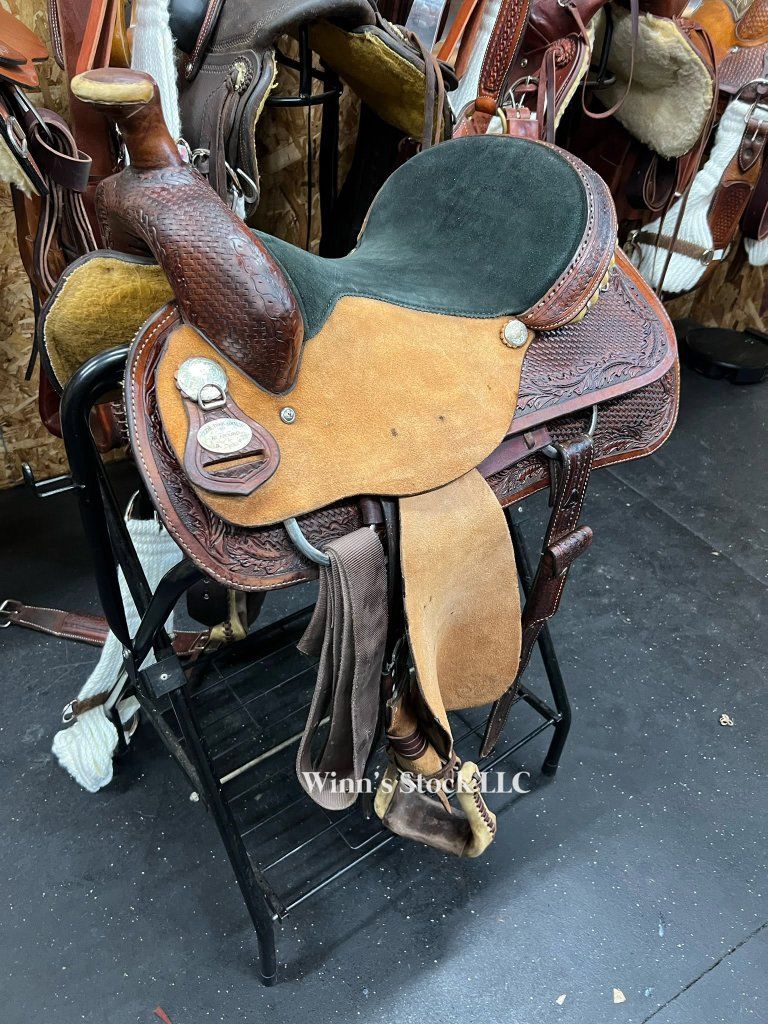 This saddle features a 15" padded suede seat, rough-out fenders, post horn, 6 1/2" gullet, SQH bars, dees on back conchos for leather ties if needed, stainless rigging, pre-twisted stirrups, fleece is good, and weight is around 34lbs.