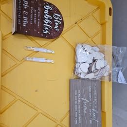-2 signs, one guestbook heart sign (with bag of hearts, 100 pack roughly 3/4 full) and one bubbles send-off sign (small bubble wands pictured for idea, NOT INCLUDED. We bought them on Amazon)