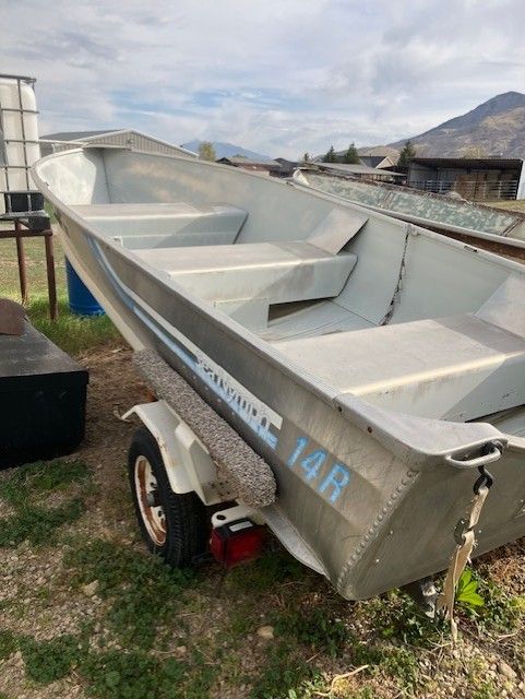 1985 SeaNymph 14R 14 foot Aluminum Boat with trailer and running 7.5 Mercury motor. This was my in-laws boat set up and they never used it, this boat has only been in the water no more than a dozen times since it was new. A couple of years ago I replaced all the wiring and lights, new tires thats never seen the asfault. There is one portable clamp on seat, and a couple of the orange type life jackets and a set of ores. The motor runs but could used a tuneup from setting, I had everything working last year to use it, and that didnt happen, so its time to move it so someone else can enjoy it. Text Is Best, Thank you,