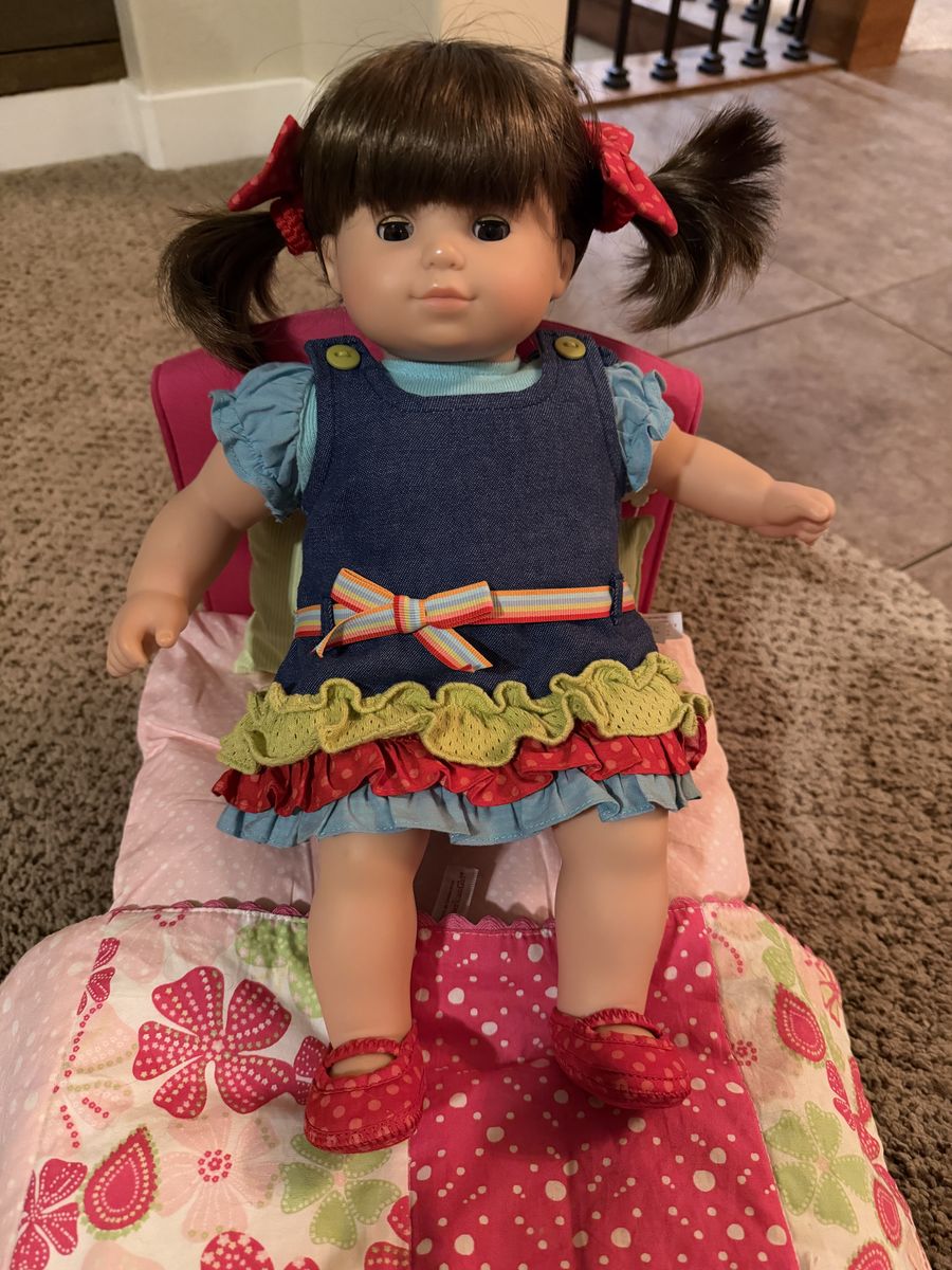 VenmoThis genuine American Girl Bitty Twin Brown Hair Girl features a soft cloth body, eyes that open and close, and hair that can be brushed or styled. The 15" doll comes with 7 complete outfits and a bed with all the pillows and bedding. She has been played with but she is in great shape and so are the extra clothes and bed.