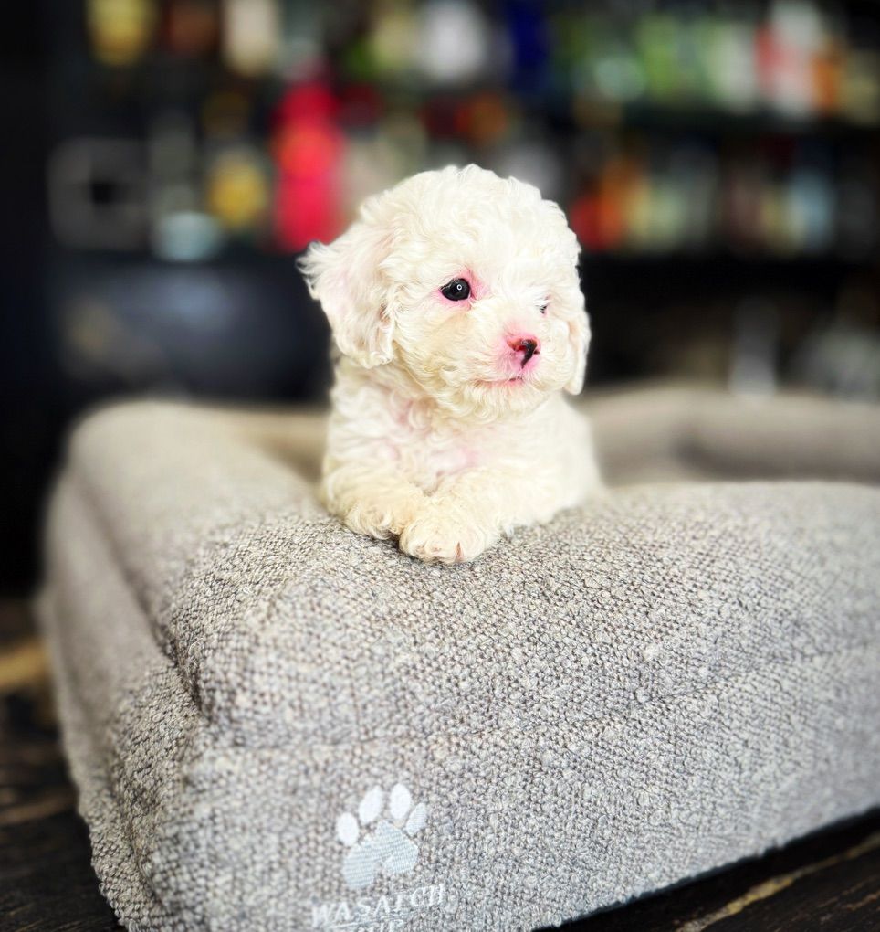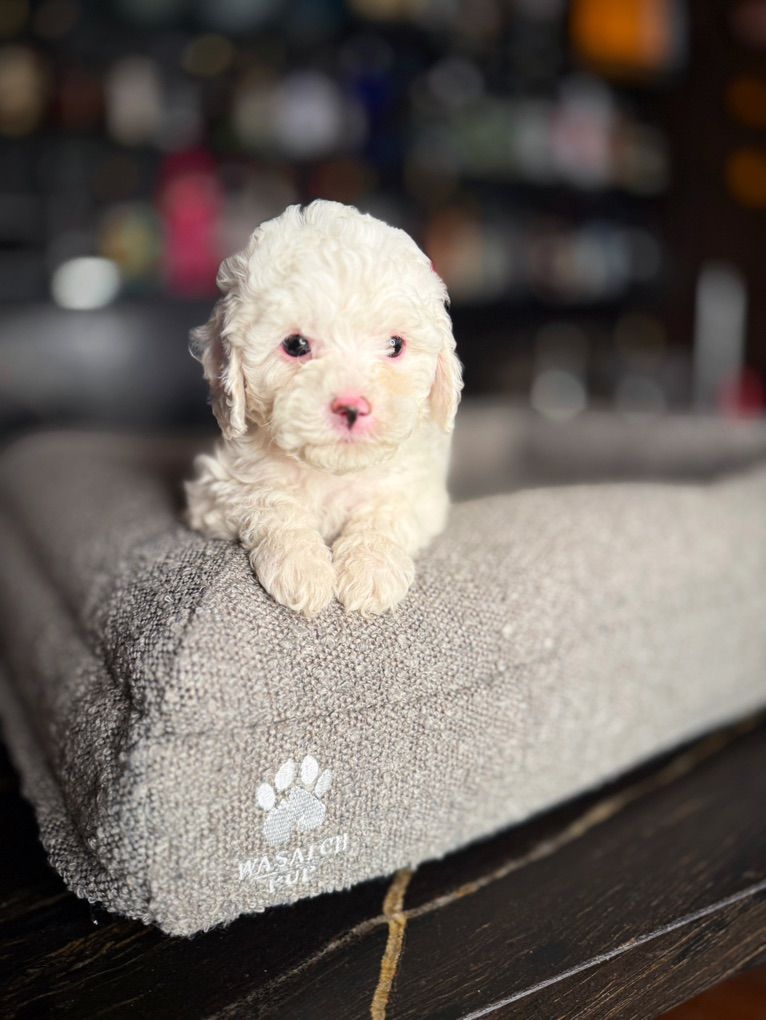 Snow looks a tiny lamb! She is so cute! Where you purchase your new furry pet matters! At wasatchpup we have been creating the most amazing family pets for over a decade! So much goes into each puppy to make sure they are trusting, confident, calm dogs! We have never had a sick puppy or a puppy returned! They will not shed at all! Both parents have beautiful temperaments and health tested!