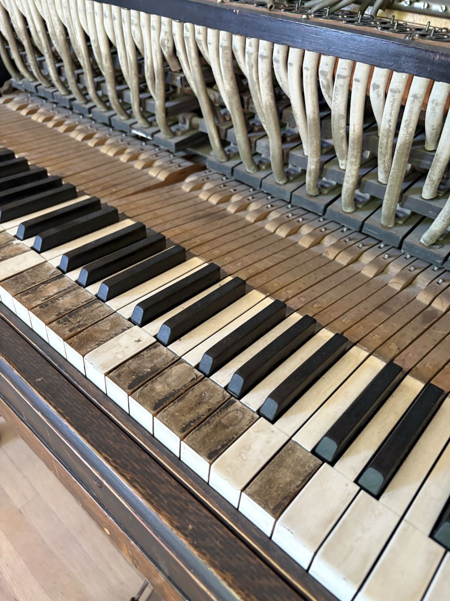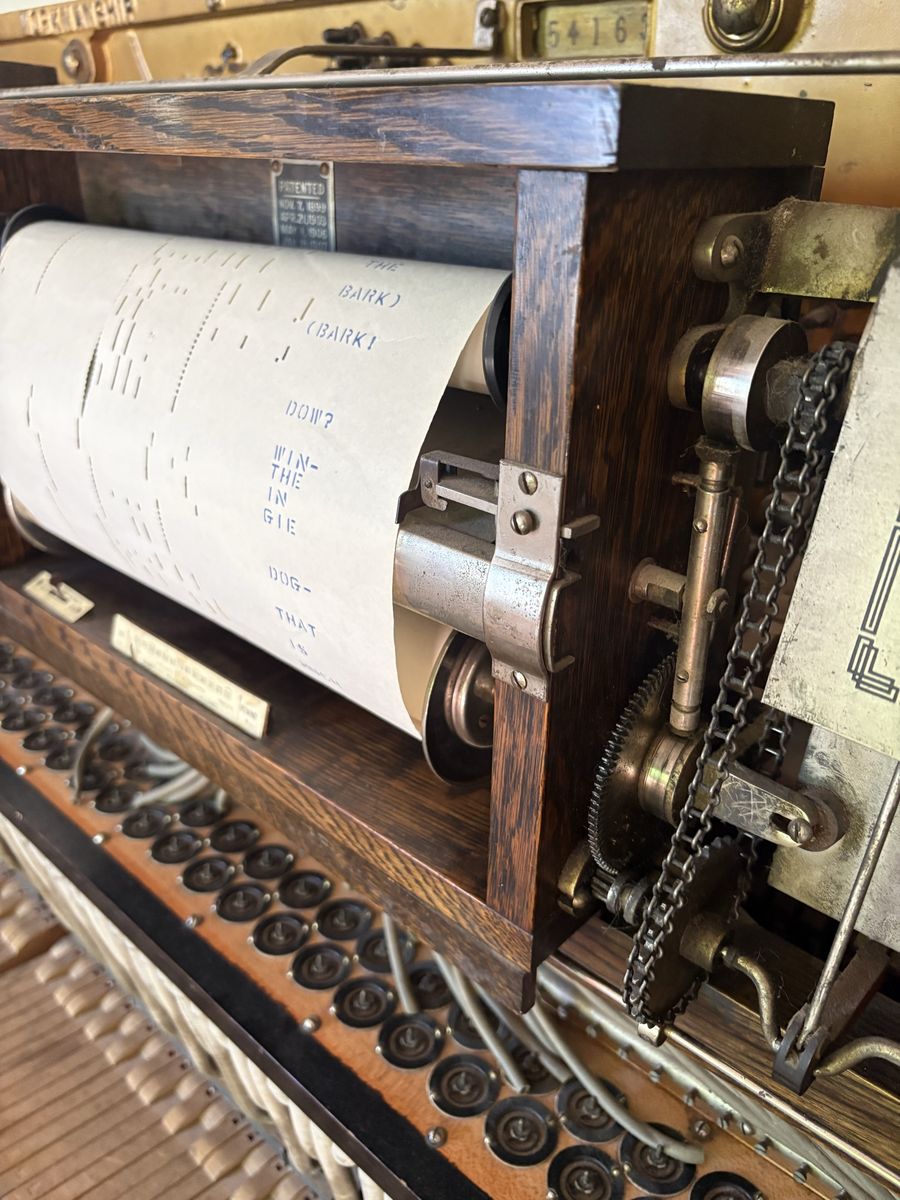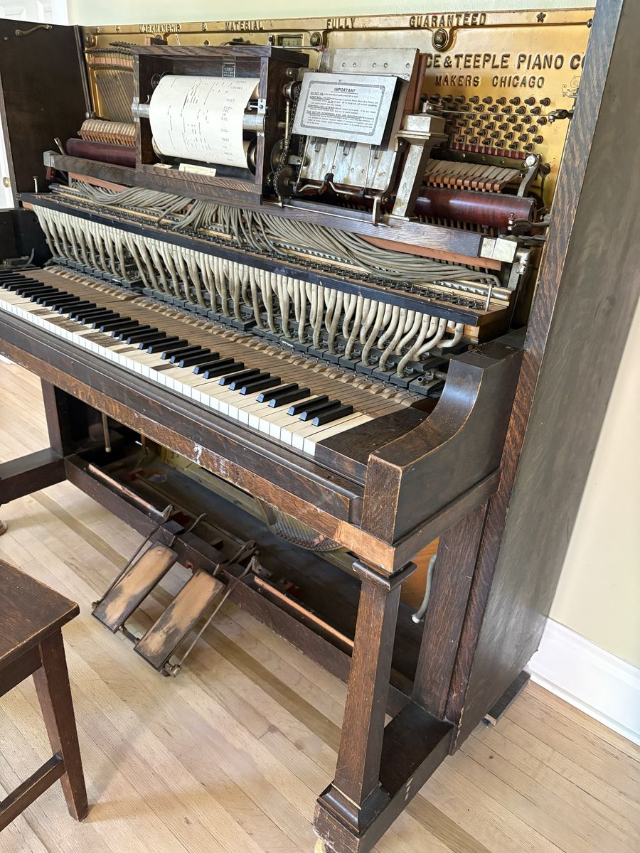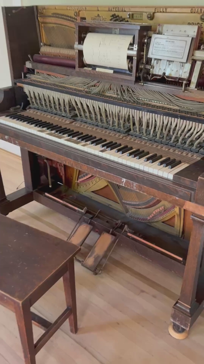 These vintage pianos don’t play on their own anymore, but they do have scrolls that you can manually scroll and follow along with the lyrics and braille-like patterns.