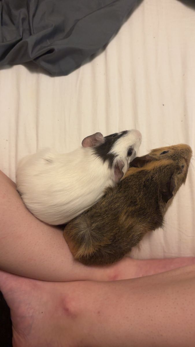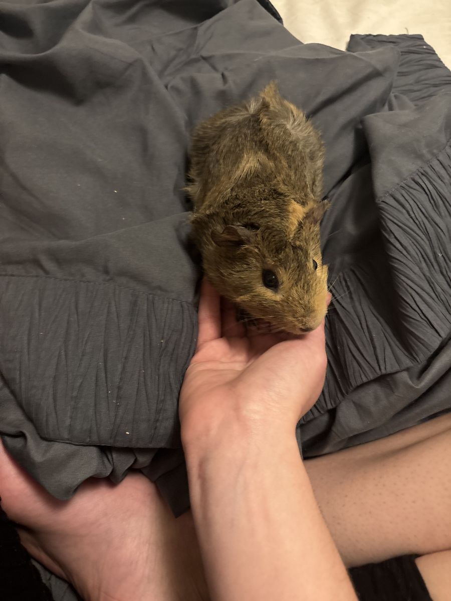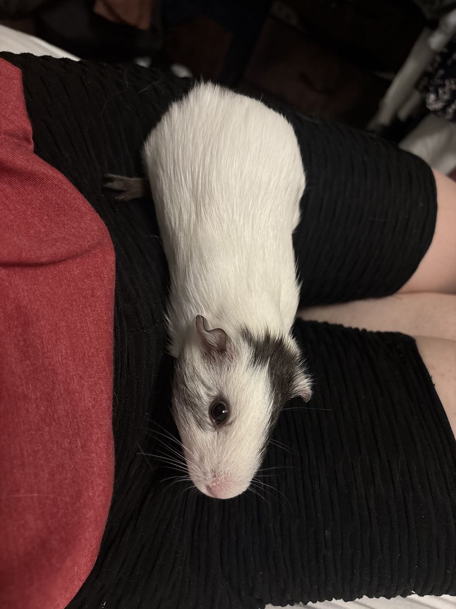 Otis is the black and white guinea pig (named after the cow in barnyard). He is vocal and loves treats! He will take them out of your hand when he is used to you! He is super chill and will cuddle with you for hours if you want! Super cute guy!
