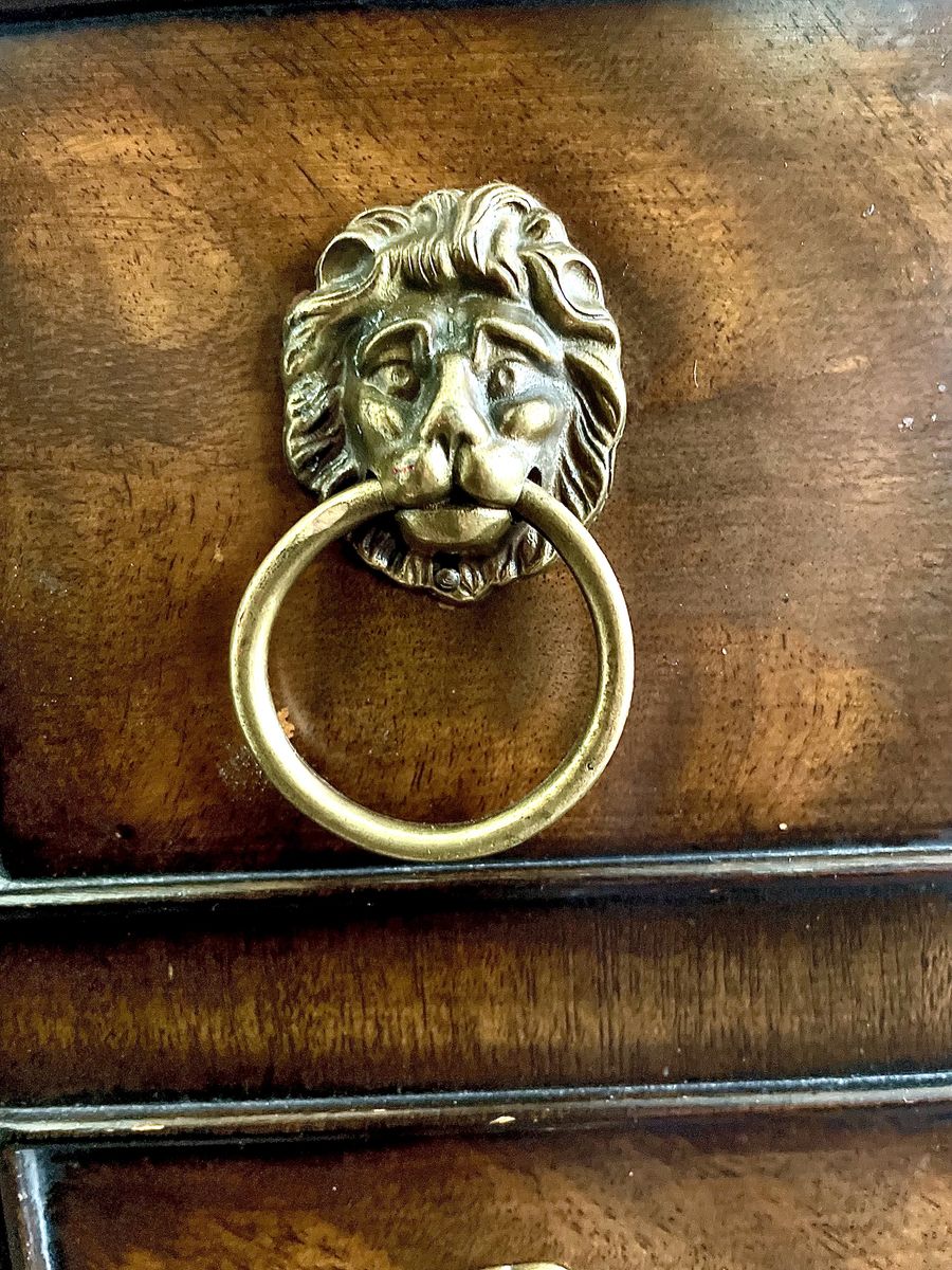The table is defined by its signature antique brass lion head ring pulls, which adorn the front-facing drawers. It rests on elegant, reeded tapered legs with brass-capped feet, embodying a sophisticated Neoclassical aesthetic.