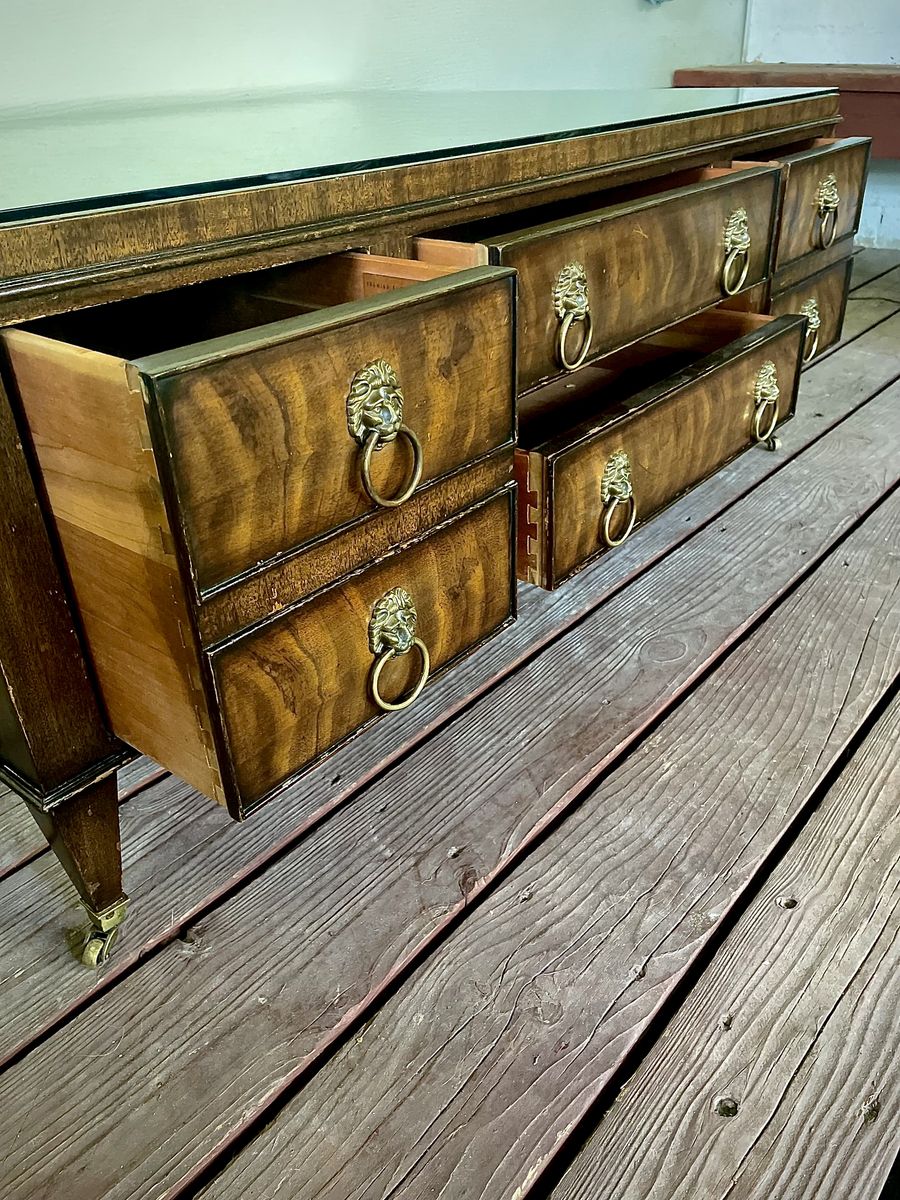 **• Maker:** EJ Victor (Morganton, NC) **• Materials:** Exotic Burlwood Veneers, Solid Walnut, and Brass Hardware **• Style:** Regency / Neoclassical **• Hardware:** 8 Authentic Brass Lion Head Ring Pulls **• Details:** Reeded legs, beveled edges, and a protective glass top protector. Dimensions (Approximate):