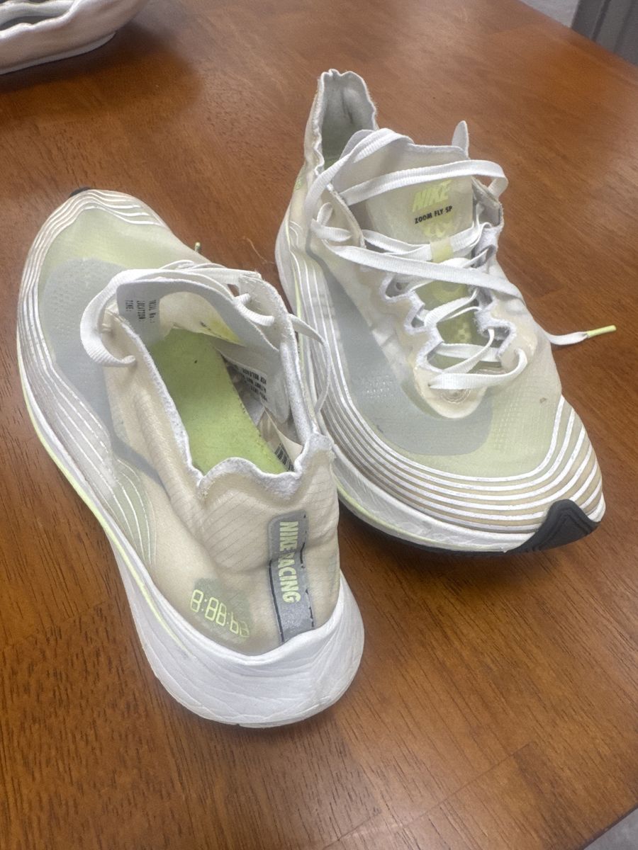 The Nike Zoom Fly SP is built fast for race day, but durable enough for everyday training. The combination of Flywire cables, Lunarlon foam, and a full-length place give you the perfect on-foot feel for record-breaking performances. Lunarlon foam gives you lightweight, durable cushioning with every step. Full-length carbon-infused nylon plate helps you optimize your performance. Flywire technology gives you enhanced midfoot lockdown, so you're always in control. Outsole design places optimal runner on the road for increased efficiency and ideal traction. Traction pattern is based off of an algorithm to identify lug shapes and sizes that optimize propulsion as you go. Translucent, woven constructed upper provides durable support and great stability for you