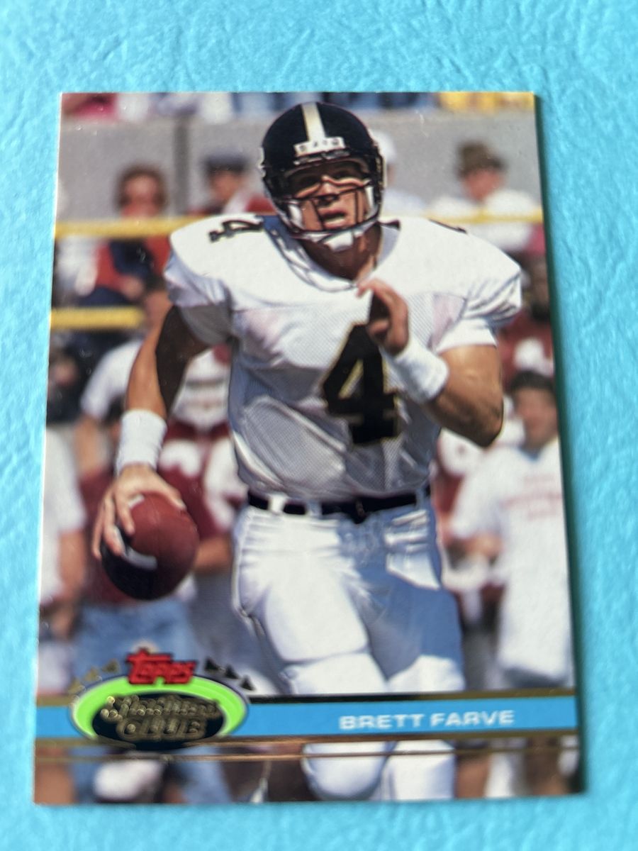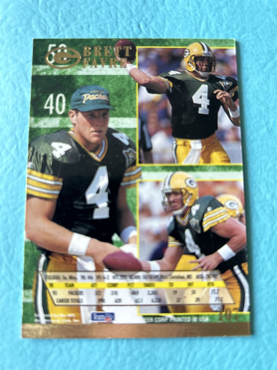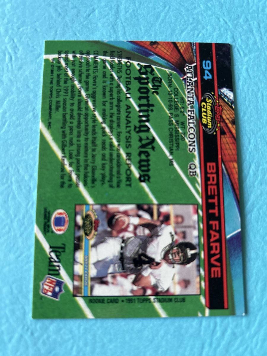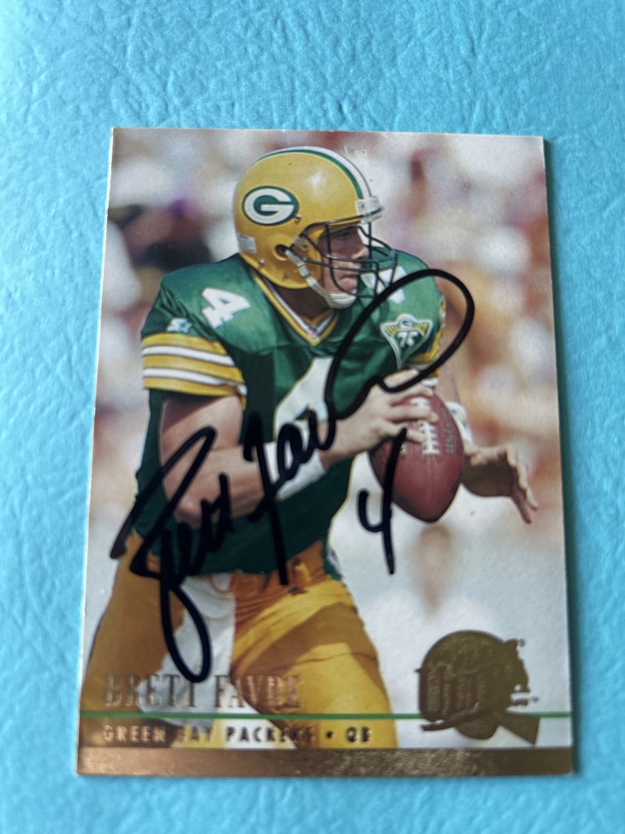 ApplePayBrett Favre Green Bay Packers Certified Hand Signed Football Card & (1) TOPPS STADIUM CLUB ROOKIE CARD.
