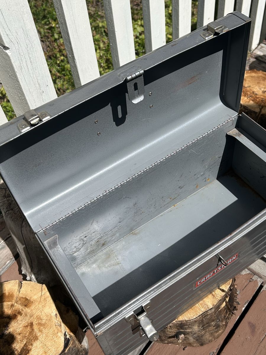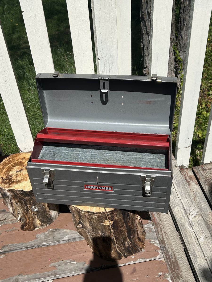 Craftsman Toolbox. Metal toolbox. I bought it back in the 1980’s. It is in good shape considering how old it is. There are a few scratches, but what do you expect from no a metal toolbox that is some 40 plus years old. If you buy it and live in Springville or Spanish Fork. We can meet at a Walmart parking lot. Dimensions are: 18”x 8”x 9”