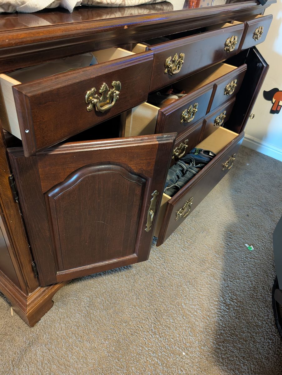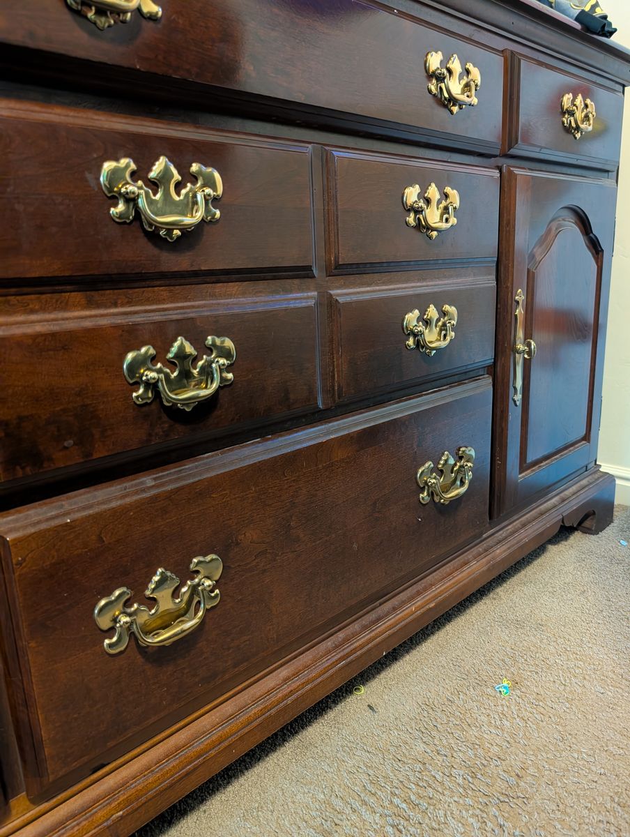 VenmoThis dresser is made out of solid wood and high quality finishes. It's a cherry-brown colored stain, with brass colored pulls.